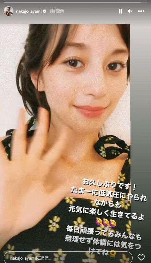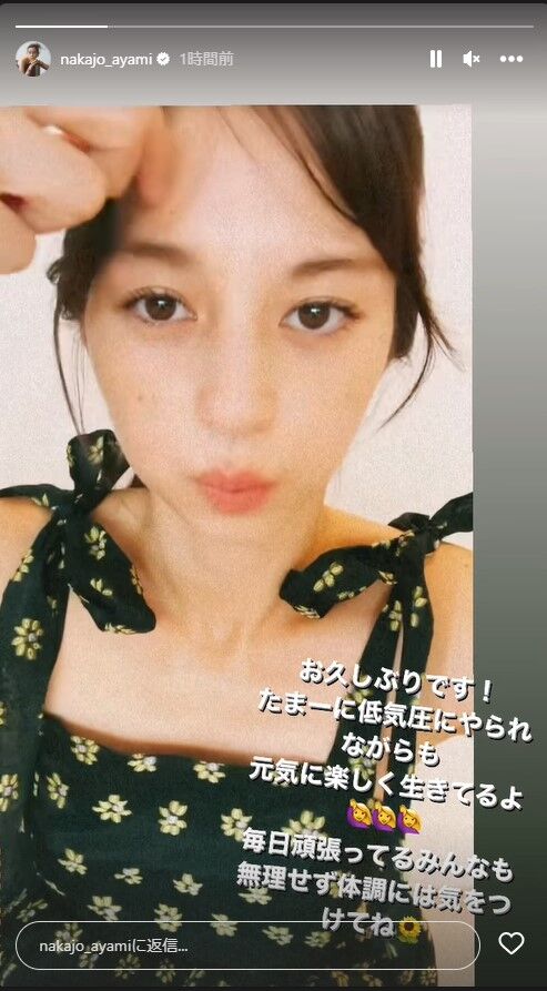 中条はストーリーズにカメラ目線で笑顔で手を振る動画をアップし「お久しぶりです! たまーに低気圧にやられながらも 元気に楽しく生きてるよ 毎日頑張ってるみんなも 無理せず体調には気をつけてね」とコメントを添えた。